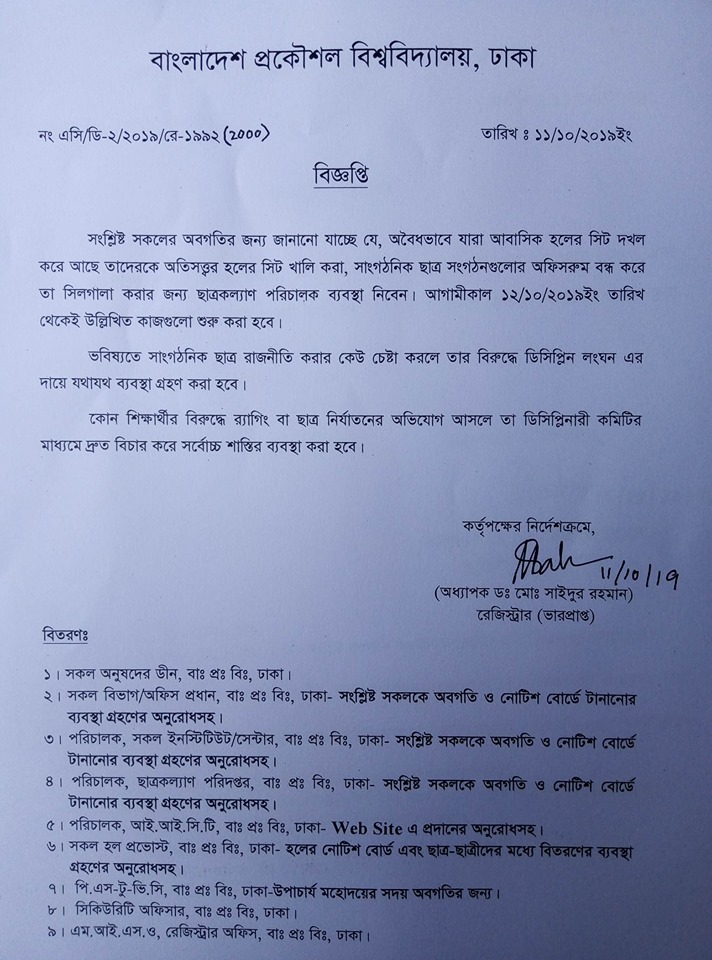 এই ৫ দাবির প্রেক্ষিতে আলাদাবাবে ৫ টি নোটিশ প্রকাশ করেছে বুয়েট প্রশাসন।