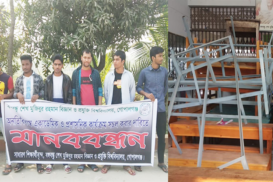একাডেমিক ও প্রশাসনিক কার্যক্রম সচল করার দাবিতে মানববন্ধন করেছে বঙ্গবন্ধু শেখ মুজিবুর রহমান বিজ্ঞান ও প্রযুক্তি বিশ্ববিদ্যালয়ের (বশেমুরবিপ্রবি) প্রায় শতাধিক শিক্ষার্থী। আজ বিশ্ববিদ্যালয়ের জয়বাংলা চত্বরে সকাল ১১টায় এ মানববন্ধন অনুষ্ঠিত হয়।