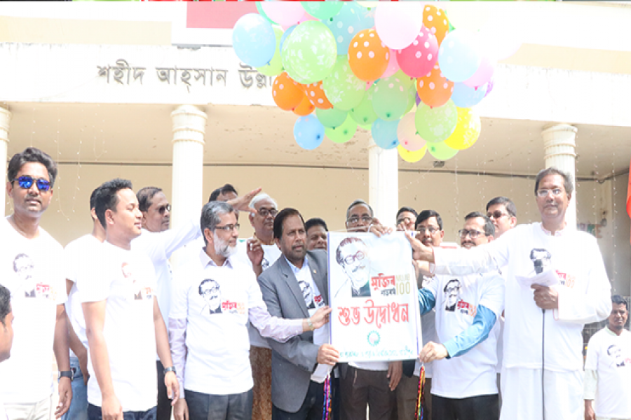 বিশ্ববিদ্যালয়ের শহীদ আহসান উল্লাহ মাস্টার মিলনায়তনের সম্মুখে বেলুন উড়িয়ে এবং পায়রা অবমুক্ত করে মুজিব বর্ষের উদ্বোধন করেন অনুষ্ঠানের প্রধান অতিথি উপাচার্য অধ্যাপক ড. মোহাম্মদ আলাউদ্দিন। এ সময় তিনি বলেন, ‘মার্চ মাস বাঙালি জাতির জীবনে একটি ঐতিহাসিক ও গুরুত্বপূর্ণ মাস। এ মাসেই সর্বকালের সর্বশ্রেষ্ঠ বাঙালি জাতির পিতা বঙ্গবন্ধু শেখ মুজিবুর রহমান ৭ মার্চের ঐতিহাসিক ভাষণ দেন, একশত বছর আগে তিনি ১৭ মার্চ এই পৃথিবীতে পদার্পণ করেন এবং ২৬ মার্চ স্বাধীনতার ঘোষণা দেন। আজ এই মহানায়কের জন্মশতবার্ষিকী। এই মাহেন্দ্রক্ষণে মুজিব বর্ষের উদ্বোধন ঘোষণা করা আমার জীবনের পরম পাওয়া।’ এছাড়া তিনি লাইব্রেরি ভবনের পাশে ‘বঙ্গবন্ধু চত্বর’ ঘোষণা করে উদ্বোধন করেন এবং বৃক্ষরোপন করেন।