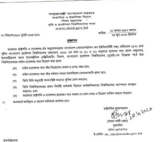 বৃহস্পতিবার (২৫ জুন) বিকেলে শিক্ষা মন্ত্রণালয়ের মাধ্যমিক ও উচ্চশিক্ষা বিভাগের বৃত্তি ও প্রকৌশল বিশ্ববিদ্যালয় শাখা এ সংক্রান্ত প্রজ্ঞাপন জারি করে।