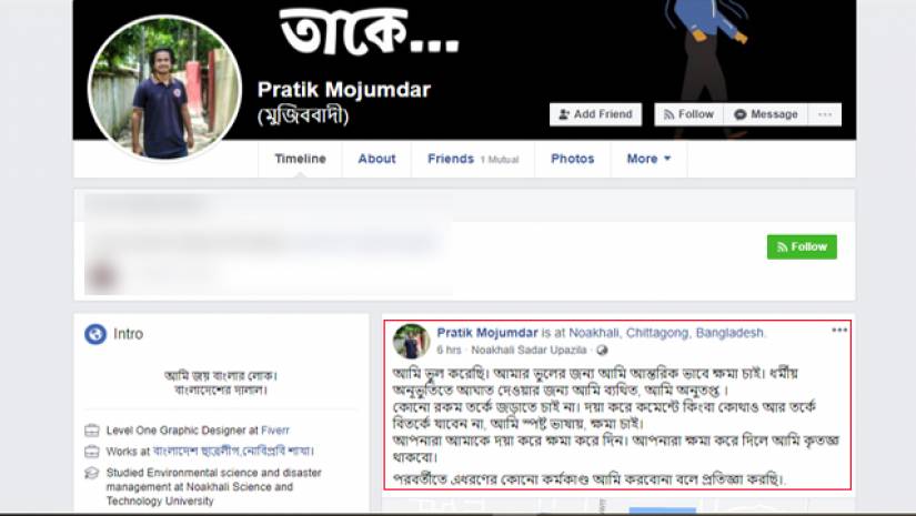 এদিকে, নিজের কৃতকর্মের জন্য অনুতপ্ত হয়ে ফেসবুকে একটি স্ট্যাটাস দিয়েছেন প্রতিক মজুমদার। সেখানে এ ধরণের কোনো কর্মকাণ্ড ভবিৎষতে করবেন না বলেও প্রতিজ্ঞা করেন তিনি।