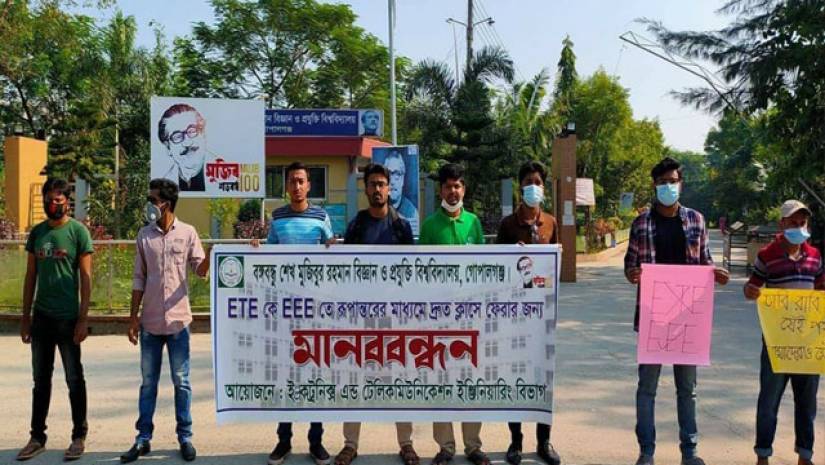 মানববন্ধন কর্মসূচি পালন করেছেন গোপালগঞ্জের বঙ্গবন্ধু শেখ মুজিবুর রহমান বিজ্ঞান ও প্রযুক্তি বিশ্ববিদ্যালয়ের (বশেমুরবিপ্রবি) ইলেকট্রনিক্স এন্ড টেলিকমিউনিকেশন ইঞ্জিনিয়ারিং (ইটিই) বিভাগের শিক্ষার্থীরা।