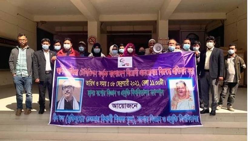 যবিপ্রবি নীল দলের আহ্বায়ক অধ্যাপক ড. মো. ইকবাল কবীর জাহিদের সভাপতিত্বে প্রতিবাদ সভায় আরও বক্তব্য দেন ডা. মো. ফিরোজ কবির, ড. মো. জাফিরুল ইসলাম, ড. শিরিন নিগার, ড. এএসএম মুজাহিদুল হক, ড. তানভীর ইসলাম, ড. মোহাম্মদ মাহফুজুর রহমান, ড. হাসান মো. আল-ইমরান, সহকারী অধ্যাপক ড. নাসিম আদনান, সহকারী অধ্যাপক ফাতেমা-তুজ-জোহরা প্রমুখ।