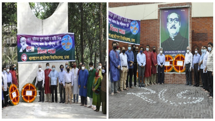 সকাল ৯টায় মহান মুক্তিযুদ্ধে বীর শহীদদের প্রতি শ্রদ্ধা নিবেদনের জন্য বাংলাদেশ প্রকৌশল বিশ্ববিদ্যালয়ের মুক্তিযুদ্ধ স্মৃতিসৌধ এবং বঙ্গবন্ধুর প্রতিকৃতিতে পুস্পার্ঘ্য অর্পণ করেন উপাচার্য অধ্যাপক ড. সত্য প্রসাদ মজুমদার ও উপ-উপাচার্য অধ্যাপক ড. আব্দুল জব্বার খাঁন। এ সময় আরো উপস্থিত ছিলেন অনুষদের ডীনেরা, বিভাগীয় প্রধানেরা, রেজিস্ট্রার, ছাত্রকল্যাণ পরিচালক, অফিস/ইনস্টিটিউট/সেন্টার প্রধানেরা, হল প্রভোস্ট ও সহকারী প্রভোস্টসহ শিক্ষক, কর্মকর্তা ও কর্মচারীরা।