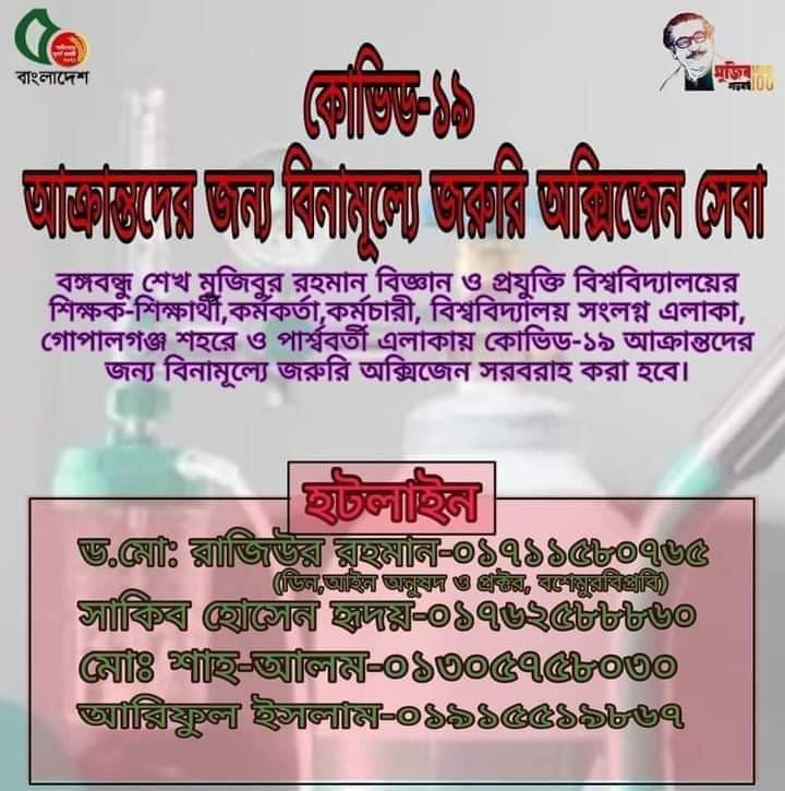 গোপালগঞ্জের বঙ্গবন্ধু শেখ মুজিবুর রহমান বিজ্ঞান ও প্রযুক্তি বিশ্ববিদ্যালয়ের (বশেমুরবিপ্রবি) শিক্ষক-শিক্ষার্থী, কর্মকর্তা, কর্মচারী, বিশ্ববিদ্যালয় সংলগ্ন এলাকা, গোপালগঞ্জ শহর ও পার্শ্ববর্তী এলাকায় কোভিড-১৯ আক্রান্তদের জন্য বশেমুরবিপ্রবির প্রক্টর ড. রাজিউর রহমানের ব্যক্তিগত উদ্যোগে বিনামূল্যে জরুরি অক্সিজেন সেবা চালু করা হয়েছে।