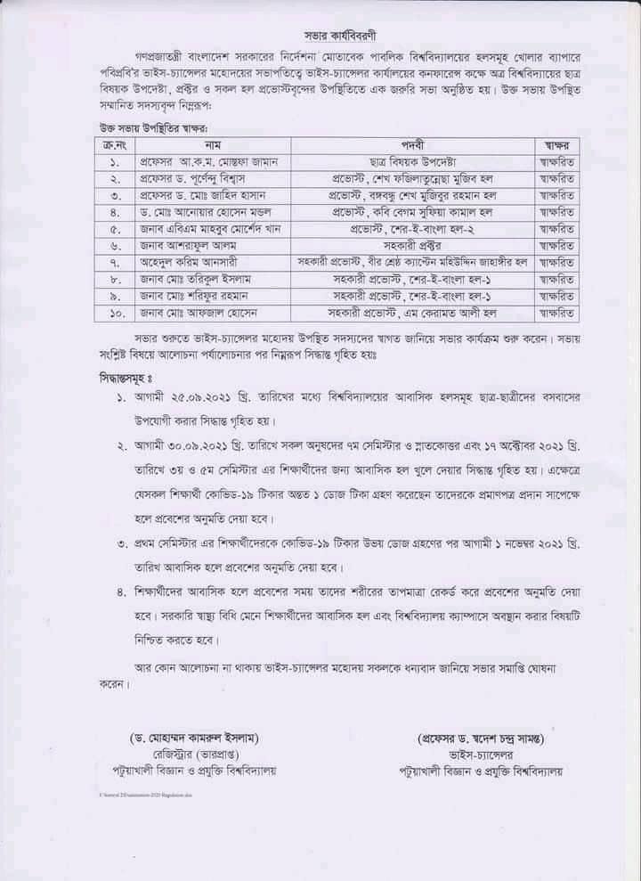 বৈঠকের সিদ্ধান্ত অনুযায়ী, আগামী ২৫ সেপ্টেম্বরের মধ্যে আবাসিক হলগুলো শিক্ষার্থীদের বসবাসের উপযোগী করে তুলতে হবে। ৩০ সেপ্টেম্বর থেকে সপ্তম সেমিস্টার এবং স্নাতকোত্তরের শিক্ষার্থীরা হলে উঠতে পারবেন। তৃতীয় এবং পঞ্চম শ্রেণির শিক্ষার্থীরা ১৭ অক্টোবর থেকে হলে উঠতে পারবেন। আর প্রথম সেমিস্টারের শিক্ষার্থীদের জন্য ১ নভেম্বর থেকে আবাসিক হলগুলো খুলে দেওয়া হবে।