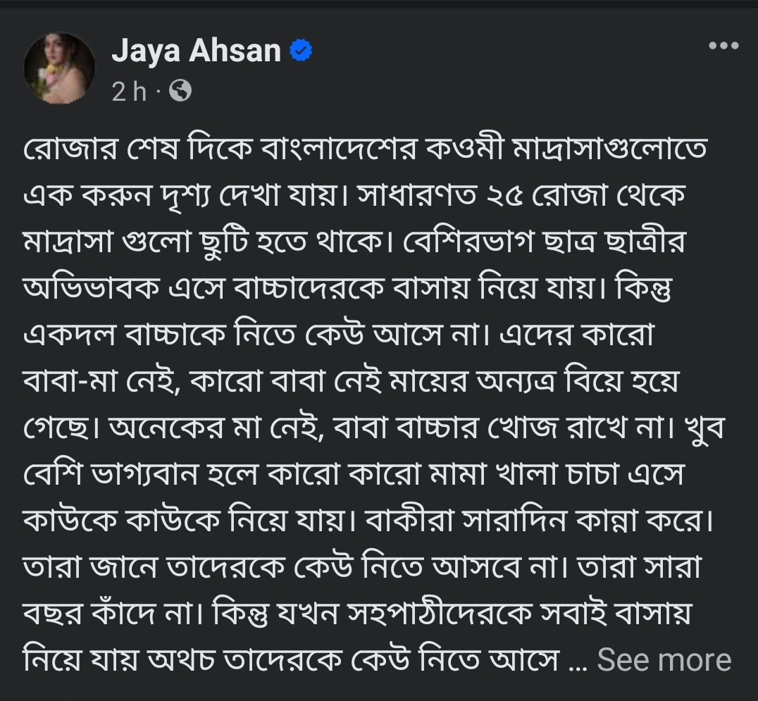 জয়া আহসানের স্ট্যাটাসে লিখেন, ‘বর্তমান সমাজে এতিম অসহায় শিশুর সংখ্যা কম নয়। দরিদ্র অসহায় দুঃস্থ ও এতিমদের জন্য ইসলাম সমাজের ওপর অনেক দায়িত্ব দিয়েছে। রোজার শেষ দিকে বাংলাদেশের কওমি মাদ্রাসাগুলোতে এক করুণ দৃশ্য দেখা যায়। সাধারণত ২৫ রোজা থেকে মাদ্রাসাগুলো ছুটি হতে থাকে। বেশিরভাগ ছাত্রছাত্রীর অভিভাবক এসে বাচ্চাদের বাসায় নিয়ে যায়। কিন্তু একদল বাচ্চাকে নিতে কেউ আসে না।’
