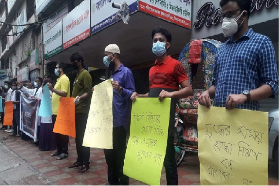 ‘যুদ্ধের সময় যােদ্ধা নিয়ােগ বন্ধ রাখবেন না’ এই প্রতিপাদ্য নিয়ে মেডিকেল কলেজগুলাের মে’২০ এর স্থগিত ফাইনাল প্রফ পরীক্ষা দ্রুততম সময়ের মধ্যে নেয়ার দাবিতে মানববন্ধন করেন ফাইনাল প্রফ পরীক্ষার্থীরা। আজ বুধবার (১৭ জুন) সকালে রাজধানীর বাংলাদেশ মেডিকেল এন্ড ডেন্টাল কাউন্সিল (বিএমডিসি) ভবনের সামনে এটি অনুষ্ঠিত হয়। মানববন্ধন থেকে তিনটি দাবি তুলে ধরা হয়।