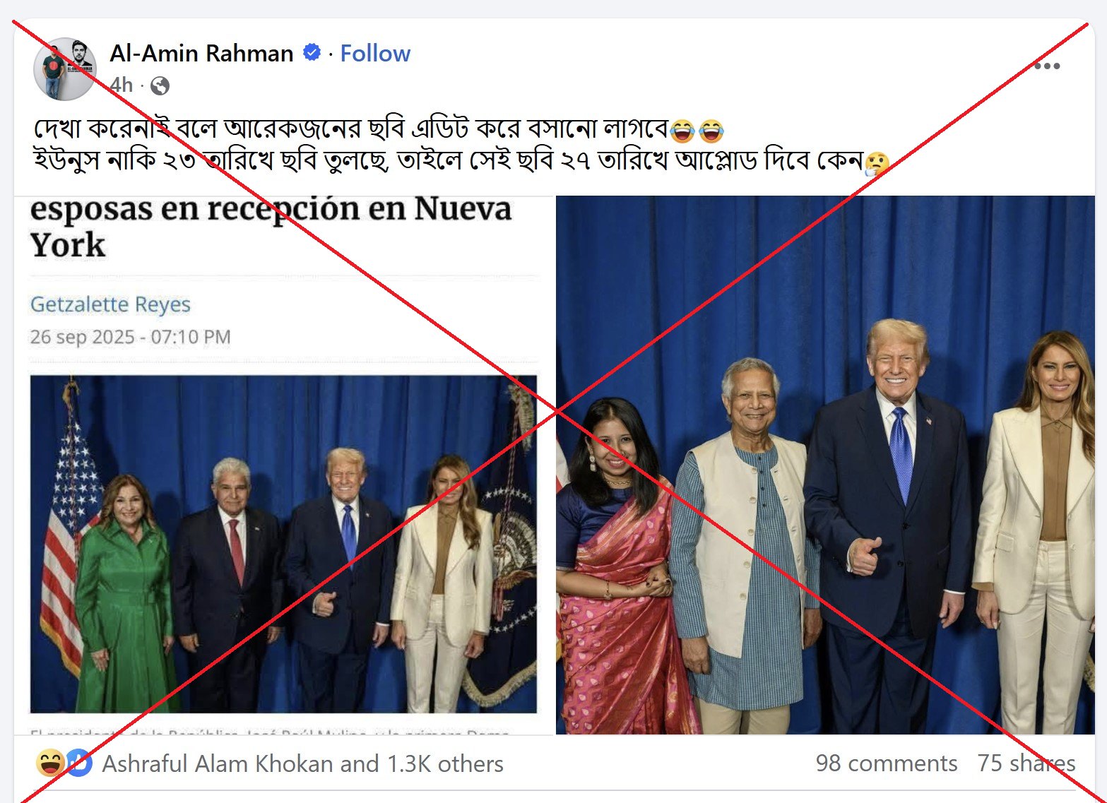 প্রেস উইংয়ের বার্তায় আরও বলা হয়, ২৩ সেপ্টেম্বর নিউইয়র্কে মার্কিন প্রেসিডেন্ট আয়োজিত এক সংবর্ধনা অনুষ্ঠানে বাংলাদেশের প্রধান উপদেষ্টা অধ্যাপক মুহাম্মদ ইউনূস এবং তার মেয়ে দীনা ইউনূসের সঙ্গে ছবি তোলেন মার্কিন প্রেসিডেন্ট ডোনাল্ড ট্রাম্প এবং ফার্স্ট লেডি মেলানিয়া ট্রাম্প।