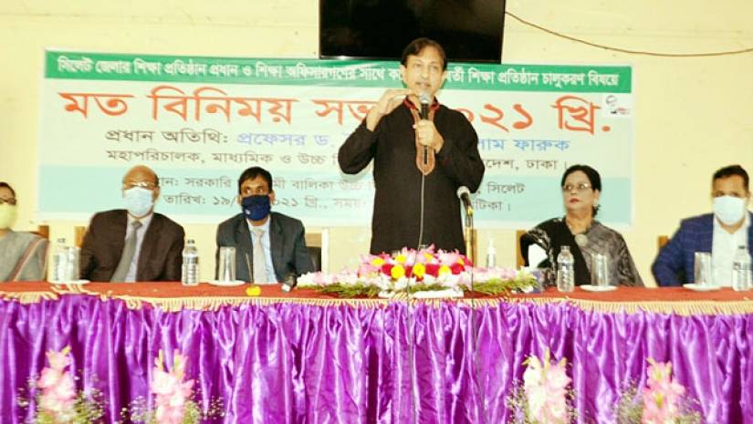 অনলাইনে ক্লাস চালু থাকায় কোভিড-১৯ এর প্রার্দুভাবেও তেমন ক্ষয়ক্ষতি হয়নি বলে জানিয়েছেন মাধ্যমিক ও উচ্চশিক্ষা অধিদফতরের (মাউশি) মহাপরিচালক (ডিজি) অধ্যাপক ড. সৈয়দ মো. গোলাম ফারুক। শুক্রবার (১৯ ফেব্রুয়ারি) বিকেলে সিলেট সরকারি অগ্রগামী বালিকা উচ্চবিদ্যালয় ও কলেজের অডিটোরিয়ামে জেলার শিক্ষাপ্রতিষ্ঠান প্রধান ও শিক্ষা অফিসারদের সঙ্গে ‘করোনা পরবর্তী শিক্ষাপ্রতিষ্ঠান চালুকরণ’ বিষয়ে এক মতবিনিময় সভায় তিনি এসব কথা বলেন।