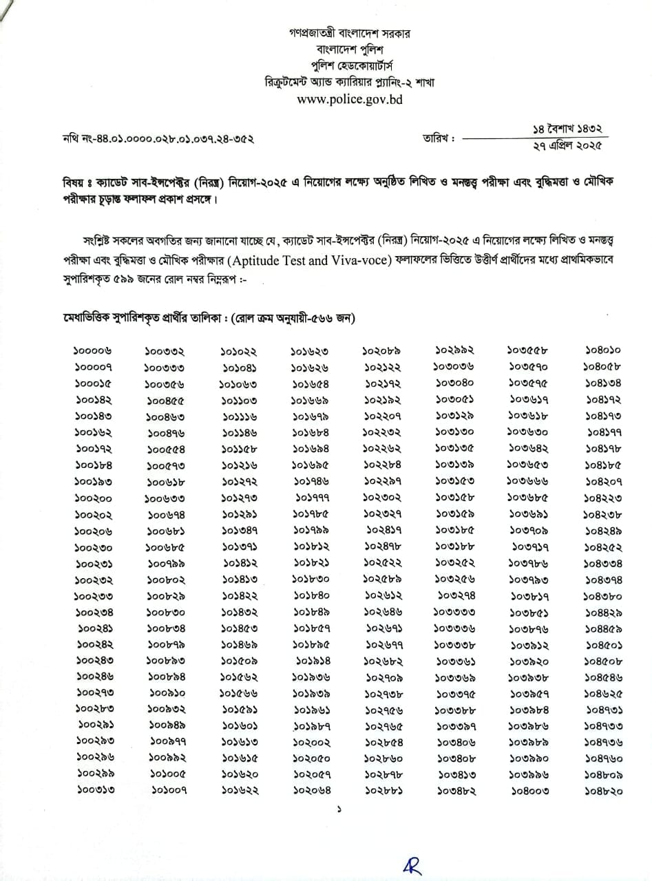 বিজ্ঞপ্তিতে বলা হয়েছে, বাংলাদেশ পুলিশের ক্যাডেট সাব-ইন্সপেক্টর (নিরস্ত্র) নিয়োগ-২০২৫-এ নিয়োগের লক্ষ্যে লিখিত ও মনস্তত্ত্ব পরীক্ষা এবং বুদ্ধিমত্তা ও মৌখিক পরীক্ষার ফলাফলের ভিত্তিতে উত্তীর্ণ প্রার্থীদের মধ্যে প্রাথমিকভাবে সুপারিশকৃত প্রার্থীদের রোল নম্বর প্রকাশ করা হলো।