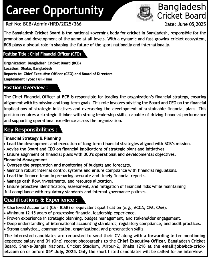 জনবল নিয়োগে বিজ্ঞপ্তি প্রকাশ করেছে বাংলাদেশ ক্রিকেট বোর্ড (বিসিবি)। প্রতিষ্ঠানটি ‘চিফ ফিন্যান্সিয়াল অফিসার (সিএফও)’ পদে কর্মকর্তা নিয়োগে ৫ জুন প্রকাশ করেছে এ বিজ্ঞপ্তি। আগ্রহী প্রার্থীরা আগামী ৫ জুলাইয়ের মধ্যে সরাসরি-ডাকযোগে অথবা সিভি পাঠিয়ে আবেদন করতে পারবেন।