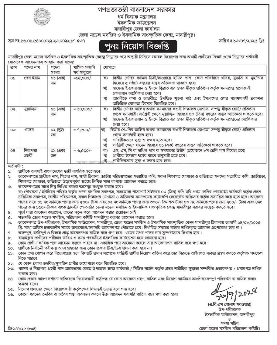 জনবল নিয়োগে বিজ্ঞপ্তি প্রকাশ করেছে ইসলামিক ফাউন্ডেশন। প্রতিষ্ঠানটি মাদারীপুর জেলা মডেল মসজিদ ও ইসলামিক সাংস্কৃতিক কেন্দ্রে ৪ পদে ৫ জনকে নিয়োগ দিতে ১৩ জুলাই প্রকাশ করেছে এ বিজ্ঞপ্তি। আবেদন ১৩ জুলাই থেকেই শুরু হয়েছে—চলবে ১৪ আগস্ট পর্যন্ত। আগ্রহী প্রার্থীরা আগামী ১৪ আগস্টের মধ্যে সরাসরি বা ডাকযোগে আবেদনপত্র পাঠিয়ে আবেদন সম্পন্ন করতে পারবেন। আবেদনপত্রের খামের ওপর পদের নাম স্পষ্টভাবে লিখতে হবে।