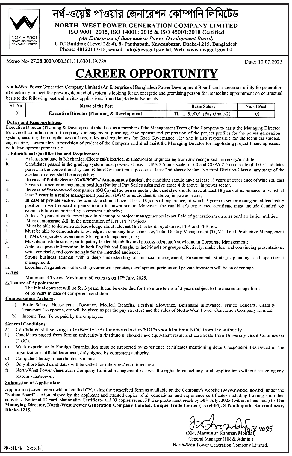 দ্য ম্যানেজিং ডিরেক্টর, নর্থ-ওয়েস্ট পাওয়ার জেনারেশন কোম্পানি লিমিটেড, ইউনিক ট্রেড সেন্টার (লেভেল-০৪), ৮ পান্থপথ, কাওরানবাজার, ঢাকা-১২১৫ বরাবর আবেদনপত্র পাঠাতে হবে;