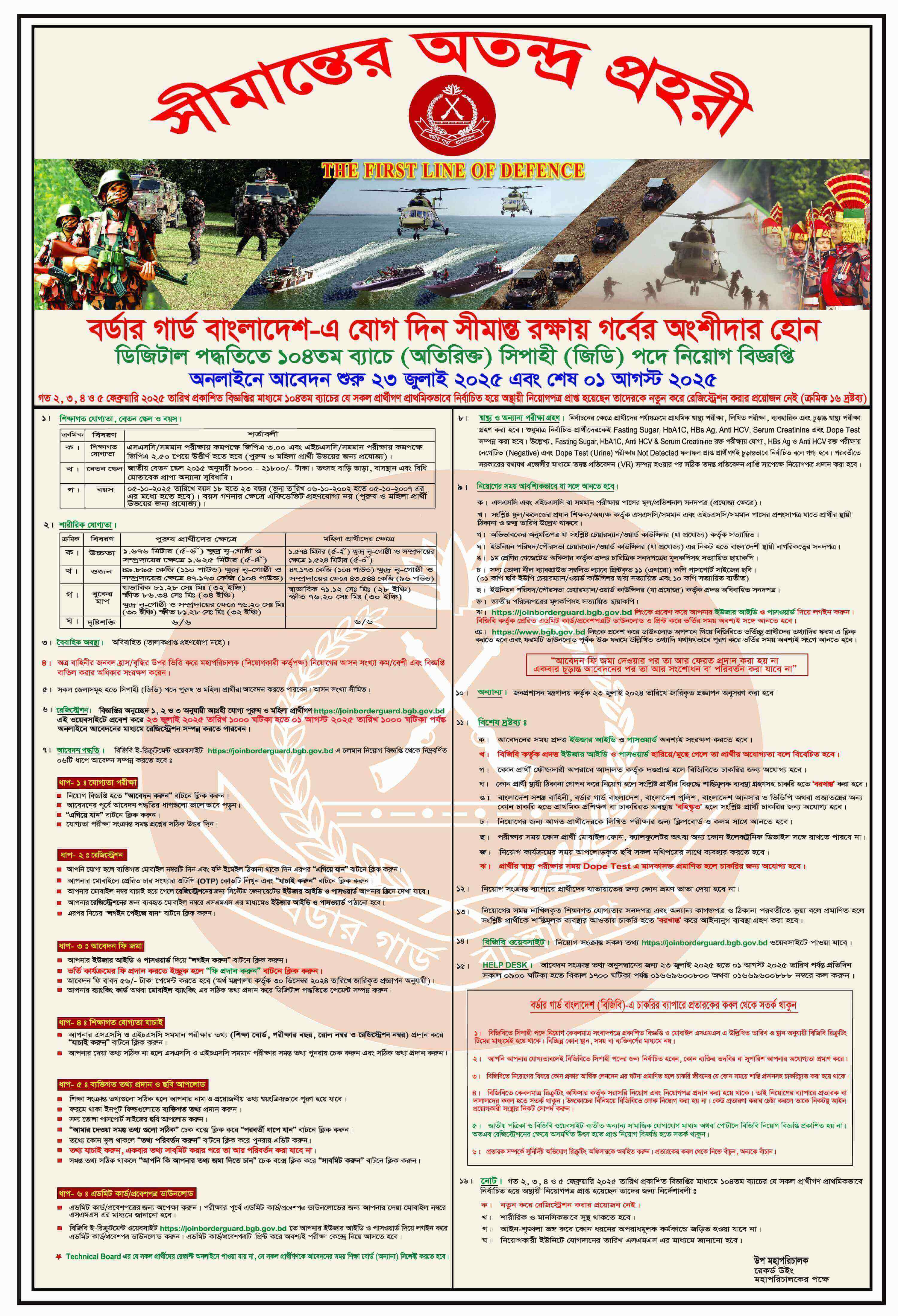 জনবল নিয়োগে বিজ্ঞপ্তি প্রকাশ করেছে বর্ডার গার্ড বাংলাদেশ (বিজিবি)। বাহিনীটি ১০৪তম ব্যাচে (অতিরিক্ত) ‘সিপাহী (জিডি)’ পদে কর্মী নিয়োগে প্রকাশ করেছে এ বিজ্ঞপ্তি। আবেদন ২৩ জুলাই থেকে শুরু হয়েছেচলবে ১ আগস্ট পর্যন্ত। আবেদন করতে হবে ৬ ধাপে। আগ্রহী প্রার্থীরা আগামী ১ আগস্টের মধ্যে অনলাইনে আবেদন করতে পারবেন।