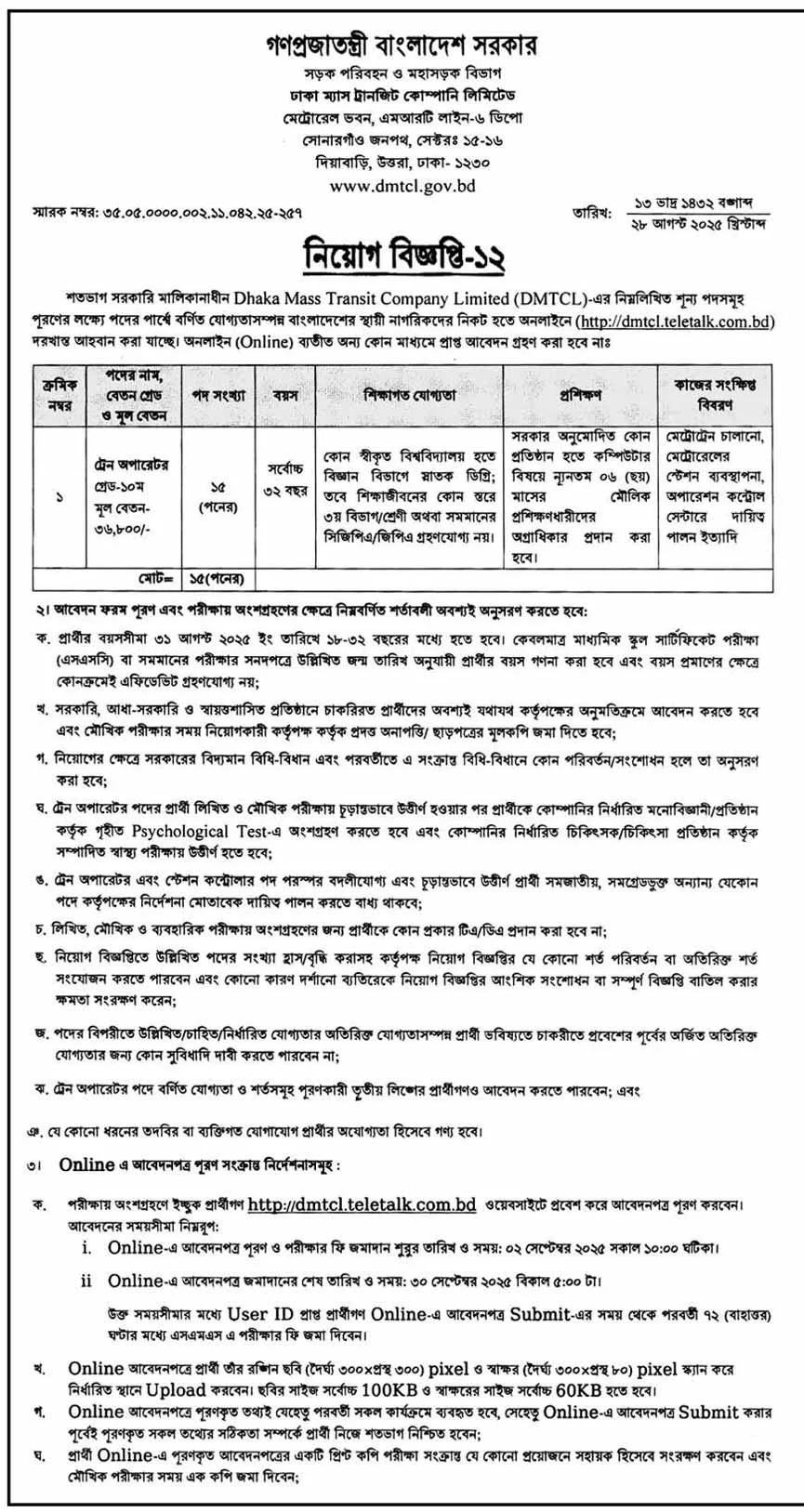 জনবল নিয়োগে বিজ্ঞপ্তি প্রকাশ করেছে ঢাকা ম্যাস ট্রানজিট কোম্পানি লিমিটেড (ডিএমটিসিএল)। প্রতিষ্ঠানটি ১০ম গ্রেডে ১৫ পদে ‘ট্রেন অপারেটর’ নিয়োগে ২৮ আগস্ট প্রকাশ করেছে এ বিজ্ঞপ্তি। বাংলাদেশের স্থায়ী নাগরিকদের নিকট থেকে অনলাইনে দরখাস্ত আহ্বান করেছে মেট্রোরেল। আবেদন ২ সেপ্টেম্বর সকাল ১০টা থেকৈ শুরু হয়ে চলবে ৩০ সেপ্টেম্বর বিকেল ৫টা পর্যন্ত। আগ্রহী প্রার্থীরা আগামী ৩০ সেপ্টেম্বরের মধ্যে অনলাইনে আবেদন করতে পারবেন।