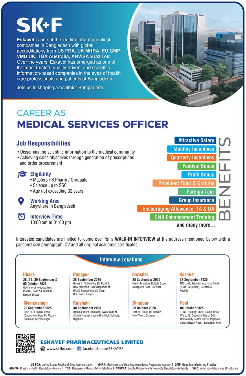 জনবল নিয়োগে বিজ্ঞপ্তি প্রকাশ করেছে ওষুধ প্রস্তুতকারক ও বিপণনে দেশের শীর্ষস্থানীয় প্রতিষ্ঠান এসকেএফ ফার্মাসিউটিক্যালস লিমিটেড। প্রতিষ্ঠানটি ‘মেডিকেল সার্ভিস অফিসার’ পদে কর্মী নিয়োগে ২৭ সেপ্টেম্বর প্রকাশ করেছে এ বিজ্ঞপ্তি। সরাসরি মৌখিক পরীক্ষার মাধ্যমে দেওয়া হবে এ নিয়োগ। মৌখিক পরীক্ষা ২৮ সেপ্টেম্বর থেকে শুরু হয়েছে—চলবে ৫ অক্টোবর পর্যন্ত। আগ্রহী প্রার্থীদের সংশ্লিষ্ট কেন্দ্রে নির্ধারিত তারিখে উপস্থিত হয়ে মৌখিক পরীক্ষায় অংশগ্রহণ করতে হবে।