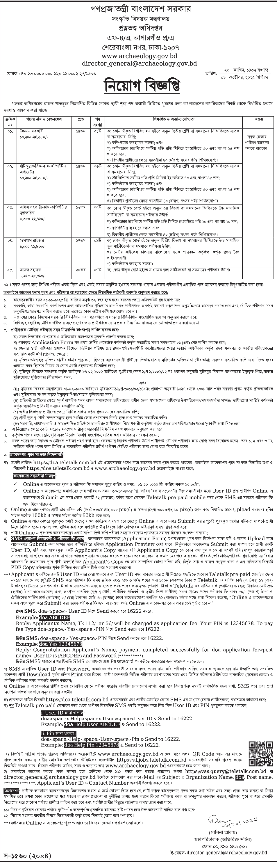 জনবল নিয়োগে বিজ্ঞপ্তি প্রকাশ করেছে সংস্কৃতিবিষয়ক মন্ত্রণালয়ের অধীন প্রত্নতত্ত্ব অধিদপ্তর। প্রতিষ্ঠানটি ১৪ থেকে ২০তম গ্রেডে ৫ পদে ১৭ কর্মকর্তা-কর্মচারী নিয়োগে ৮ অক্টোবর প্রকাশ করেছে এ বিজ্ঞপ্তি। আবেদন ৯ অক্টোবর সকাল ৯টা থেকে শুরু হয়েছে—চলবে ৩০ অক্টোবর বিকেল ৫টা পর্যন্ত। আগ্রহী প্রার্থীরা আগামী ৩০ অক্টোবরের মধ্যে অনলাইনে আবেদন করতে পারবেন।