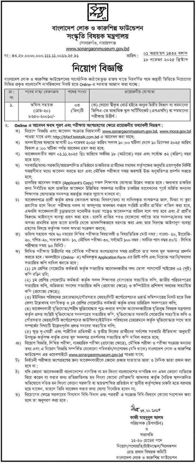 বাংলাদেশ লোক ও কারুশিল্প ফাউন্ডেশনে চাকরি, আবেদন অনলাইনে