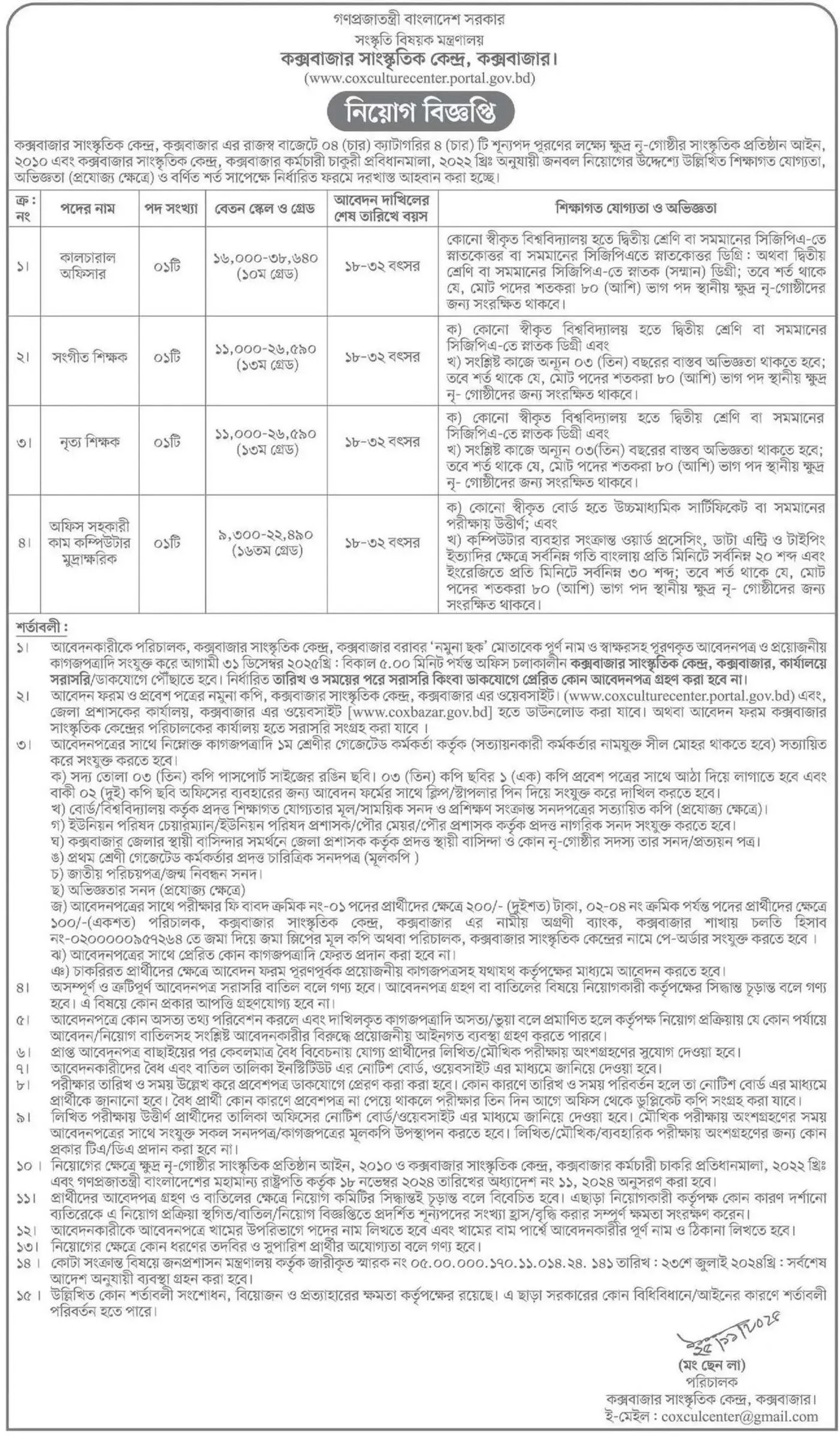 কক্সবাজার সাংস্কৃতিক কেন্দ্রে বিভিন্ন গ্রেডে চাকরি, আবেদন সরাসরি-ডাকযোগে