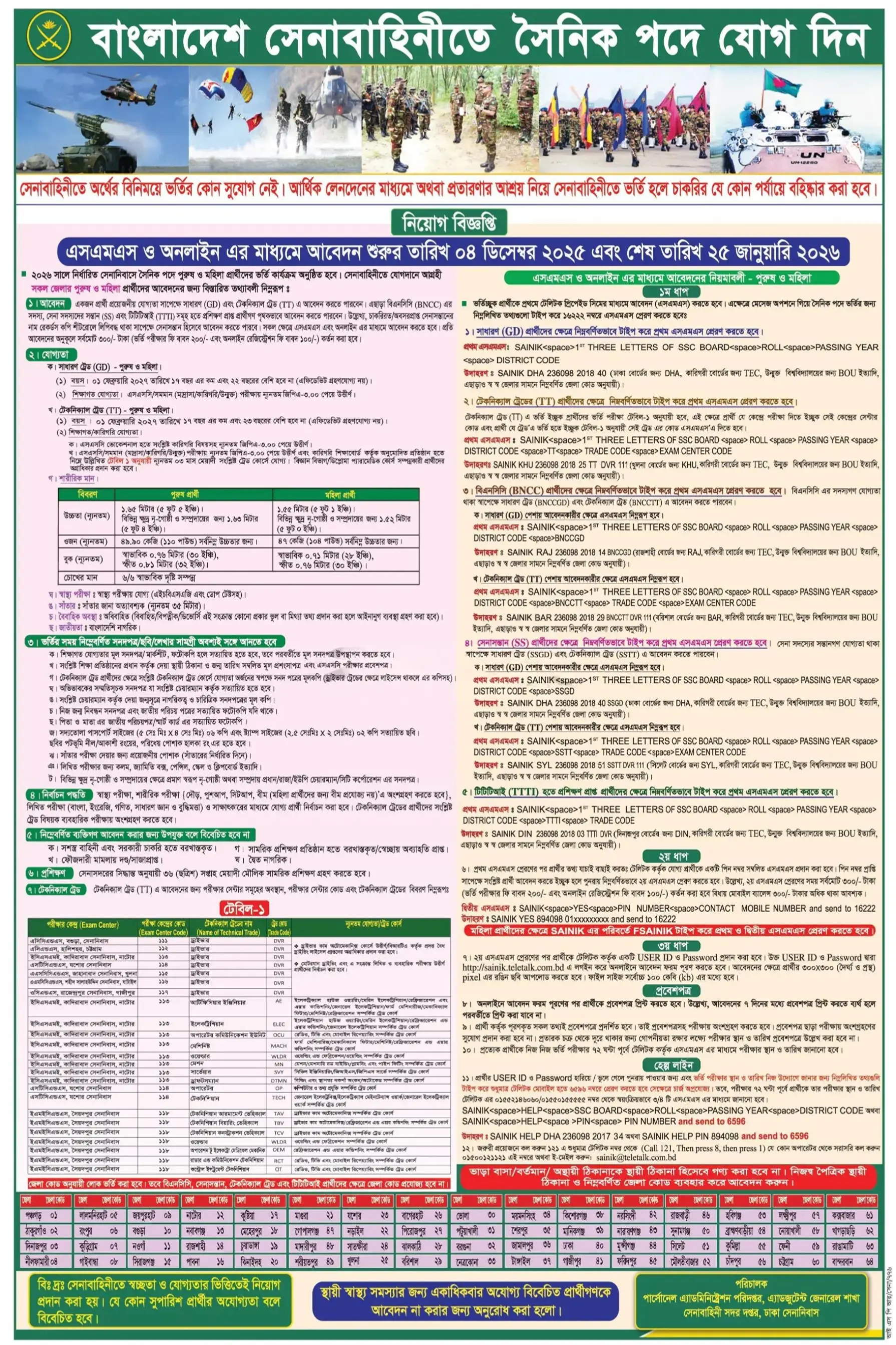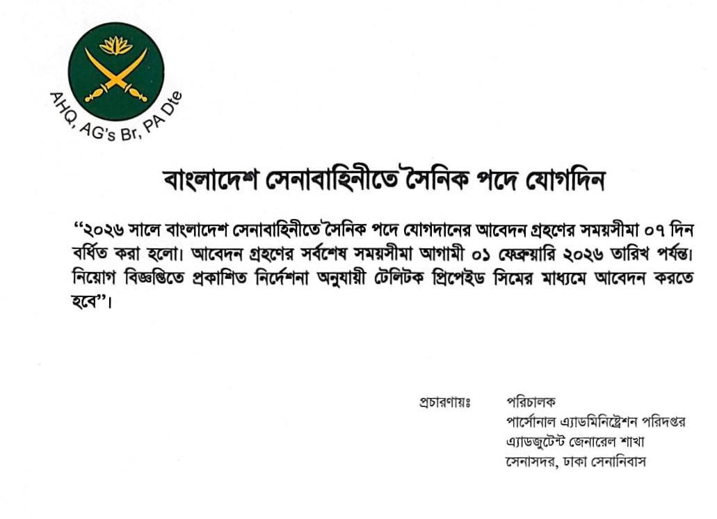 বাংলাদেশ সেনাবাহিনী সৈনিক পদে আবেদনের সময়সীমা বাড়িয়েছে। পূর্বে আবেদনের সময়সীমা ছিল ২৫ জানুয়ারি ২০২৬ পর্যন্ত। নতুন সময়সীমা ১ ফেব্রুয়ারি ২০২৬ পর্যন্ত। আগ্রহী প্রার্থীরা আগামী ১ ফেব্রুয়ারি ২০২৬ পর্যন্ত এসএমএস ও অনলাইনে আবেদন করতে পারবেন।