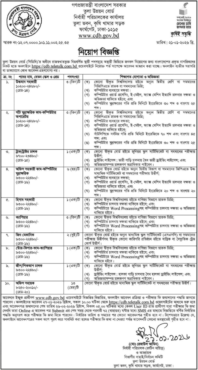 জনবল নিয়োগে বিজ্ঞপ্তি প্রকাশ করেছে তুলা উন্নয়ন বোর্ড (সিডিবি)। প্রতিষ্ঠানটি ১৪ থেকে ২০তম গ্রেডে ১০ পদে ৩৪ কর্মী নিয়োগে ২১ জানুয়ারি প্রকাশে করেছে এ বিজ্ঞপ্তি। আবেদন ২৭ জানুয়ারি সকাল ১০টা থেকে শুরু হয়ে চলবে ২৬ ফেব্রুয়ারি বিকেল ৫টা পর্যন্ত। আগ্রহী প্রার্থীরা আগামী ২৬ ফেব্রুয়ারির মধ্যে অনলাইনে আবেদন করতে পারবেন।