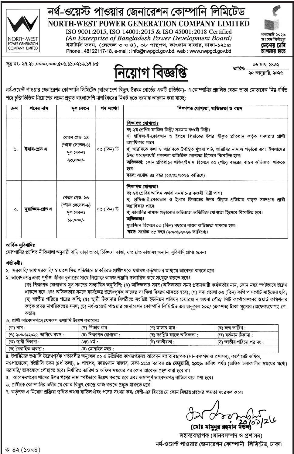 ইমাম ও মুয়াজ্জিন নিয়োগে আবেদন চলছে নর্থ-ওয়েস্ট পাওয়ার জেনারেশন কোম্পানিতে © সংগৃহীত