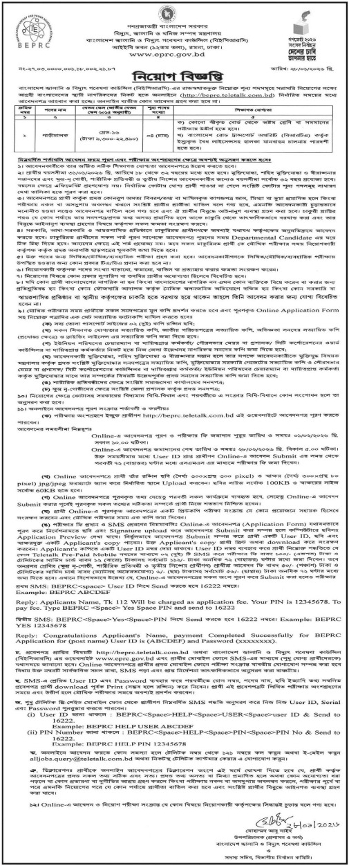জনবল নিয়োগে বিজ্ঞপ্তি প্রকাশ করেছে বিদ্যুৎ, জ্বালানি ও খনিজ সম্পদ মন্ত্রণালয়ের অধীন বাংলাদেশ জ্বালানি ও বিদ্যুৎ গবেষণা কাউন্সিল (বিইপিআরসি)। প্রতিষ্ঠানটি ১৬তম গ্রেডে ‘গাড়িচালক’ পদে ৪ কর্মী নিয়োগে ২৮ জানুয়ারি প্রকাশ করেছে এ বিজ্ঞপ্তি। আবেদন ১ ফেব্রুয়ারি সকাল ১০টা থেকে শুরু হয়ে চলবে ২৮ ফেব্রুয়ারি বিকেল ৫টা পর্যন্ত। আগ্রহী প্রার্থীরা আগামী ২৮ ফেব্রুয়ারির মধ্যে অনলাইনে আবেদন করতে পারবেন।