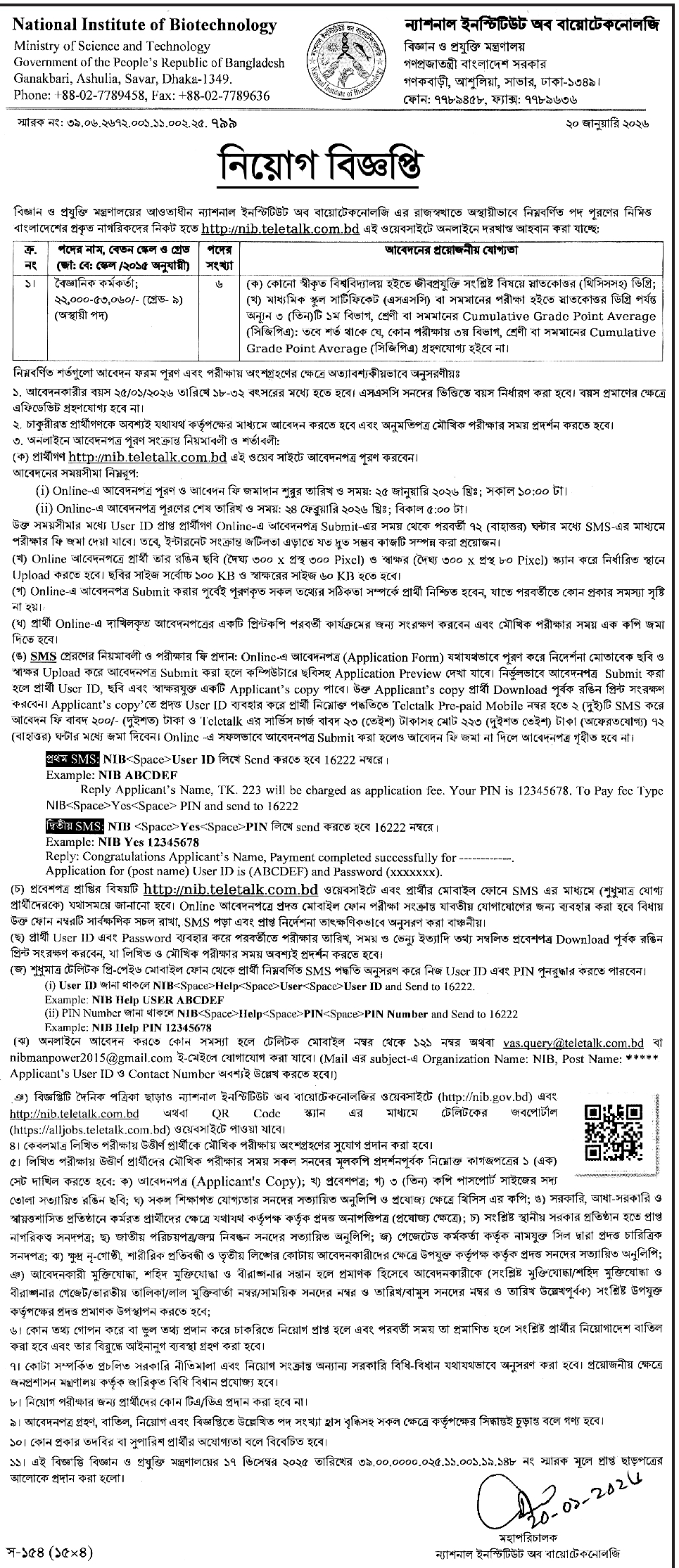 প্রতিষ্ঠানের নাম: ন্যাশনাল ইনস্টিটিউট অব বায়োটেকনোলজি (বিজ্ঞান ও প্রযুক্তি মন্ত্রণালয়);