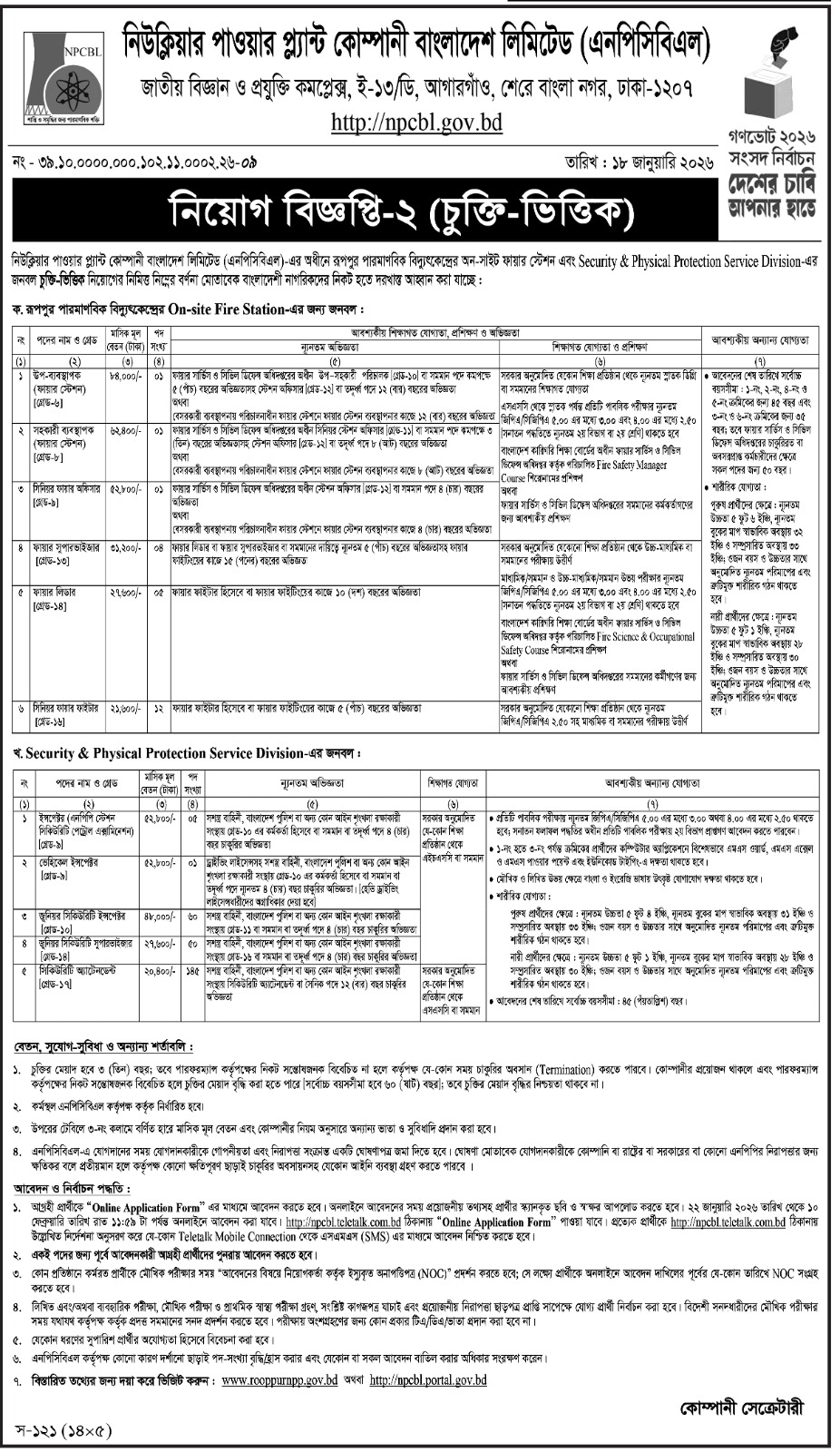 জনবল নিয়োগে বিজ্ঞপ্তি প্রকাশ করেছে নিউক্লিয়ার পাওয়ার প্ল্যান্ট কোম্পানি বাংলাদেশ লিমিটেড (এনপিসিবিএল)। প্রতিষ্ঠানটি রূপপুর পারমাণবিক বিদ্যুৎকেন্দ্রের নিরাপত্তা ও অগ্নিনির্বাপণ ব্যবস্থার জন্য জনবল নিয়োগ দেবে। প্রতিষ্ঠানটি বিভিন্ন গ্রেডে ১১ পদে ২৮৫ কর্মকর্তা-কর্মচারী নিয়োগে ১৮ জানুয়ারি প্রকাশ করেছে এ বিজ্ঞপ্তি। আবেদন ২২ জানুয়ারি সকাল ১০টা থেকে শুরু হয়ে চলবে ১০ ফেব্রুয়ারি রাত ১১টা ৫৯ মিনিট পর্যন্ত। আগ্রহী প্রার্থীরা আগামী ১০ ফেব্রুয়ারির মধ্যে অনলাইনে আবেদন করতে পারবেন।
