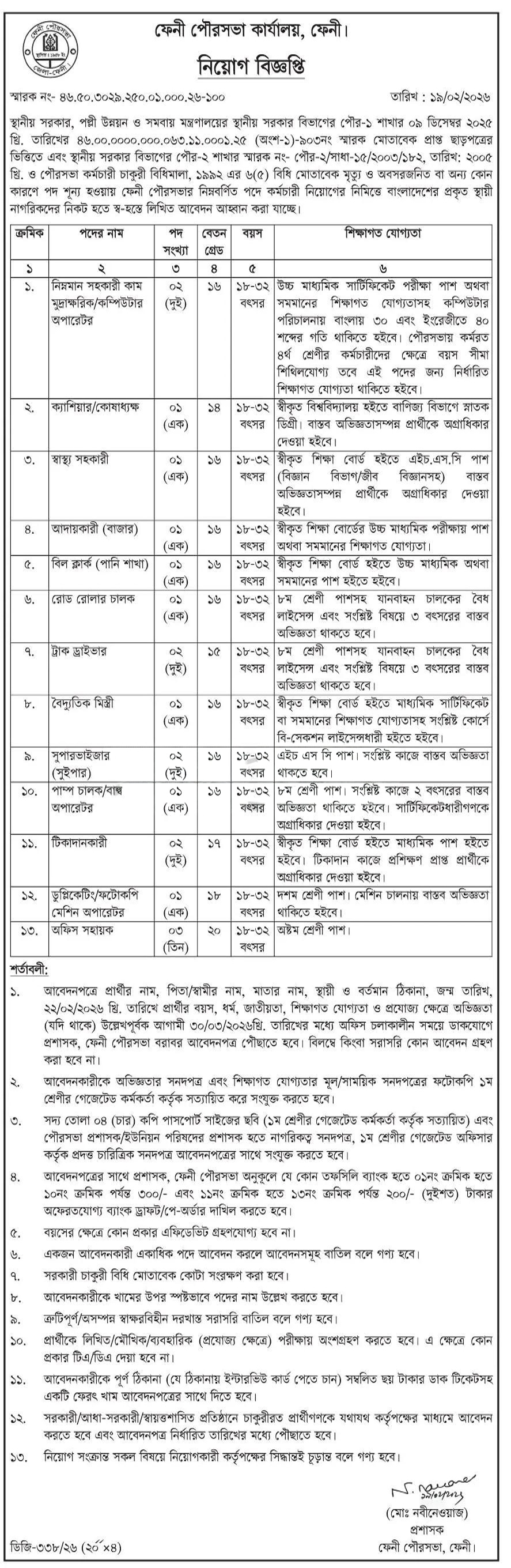 ১৩ পদে ১৯ কর্মচারী নিয়োগে আবেদন চলছে ফেনী পৌরসভা কার্যালয়ে © সংগৃহীত