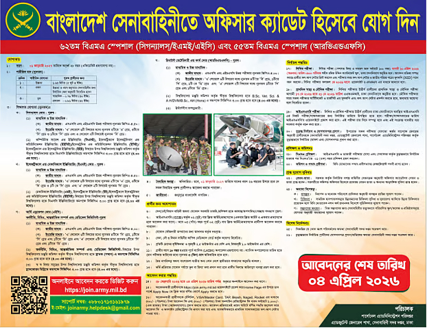 জনবল নিয়োগে বিজ্ঞপ্তি প্রকাশ করেছে বাংলাদেশ সেনাবাহিনী। প্রতিষ্ঠানটি ৬২তম বিএমএ স্পেশাল (সিগন্যালস/ইএমই/এইসি) এবং ৫৫তম বিএমএ স্পেশাল (আরভিএন্ডএফসি) কোর্সের অধীন ‘অফিসার ক্যাডেট’ পদে নিয়োগ দেবে। শুধু পুরুষ প্রার্থীরা আগামী ৪ এপ্রিলের মধ্যে অনলাইনে আবেদন করতে পারবেন।