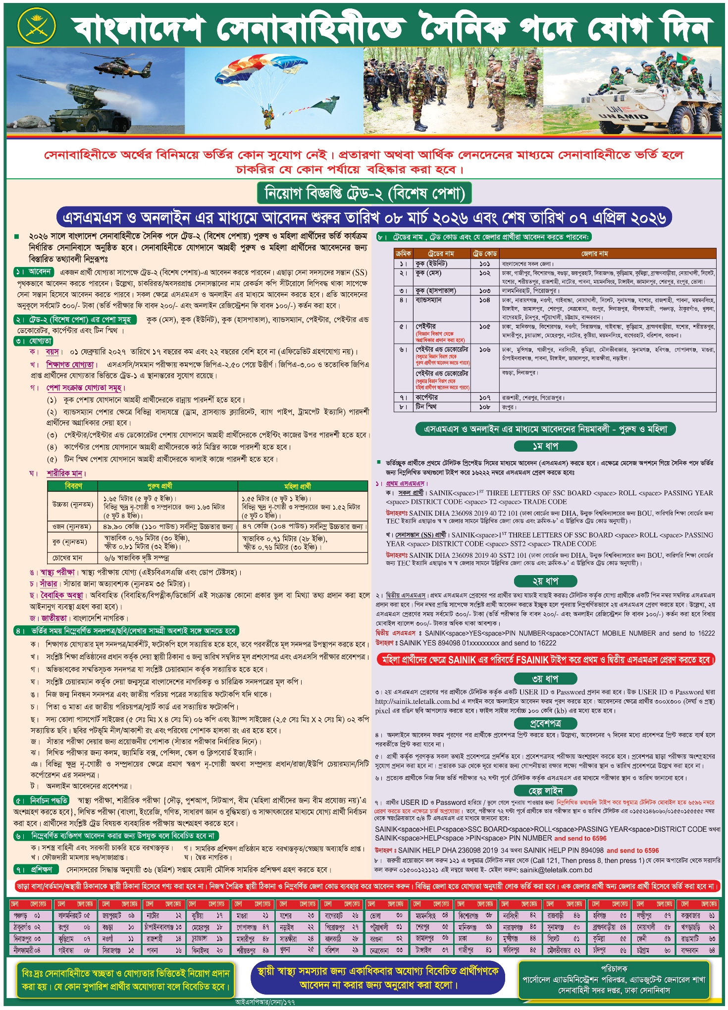 জনবল নিয়োগে বিজ্ঞপ্তি প্রকাশ করেছে বাংলাদেশ সেনাবাহিনী। প্রতিষ্ঠানটি ‘সৈনিক’ পদে ট্রেড-২–এর (বিশেষ পেশা) অধীনে এই নিয়োগ দেবে। ট্রেড-২ (বিশেষ পেশা)-এর পেশাসমূহ হলো কুক (মেস), কুক (ইউনিট), কুক (হাসপাতাল), ব্যান্ডসম্যান, পেইন্টার, পেইন্টার অ্যান্ড ডেকোরেটর, কার্পেন্টার ও টিন স্মিথ। আবেদন ৮ মার্চ থেকে শুরু হয়ে চলবে ৭ এপ্রিল পর্যন্ত। আগ্রহী প্রার্থীরা আগামী ৭ এপ্রিলের মধ্যে অনলাইনে আবেদন করতে পারবেন।
