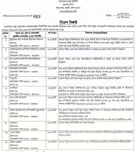 জনবল নিয়োগে বিজ্ঞপ্তি প্রকাশ করেছে বাংলাদেশ সেতু কর্তৃপক্ষ। প্রতিষ্ঠানটি ৯ থেকে ২০তম গ্রেডে ১১ পদে ১৭ কর্মকর্তা-কর্মচারী নিয়োগে ৩০ মার্চ প্রকাশ করেছে এ বিজ্ঞপ্তি। আবেদন ২ এপ্রিল সকাল ৯টা থেকে শুরু হয়ে চলবে ৩০ এপ্রিল বিকেল ৫টা পর্যন্ত। আগ্রহী প্রার্থীরা আগামী ৩০ এপ্রিলের মধ্যে অনলাইনে আবেদন করতে পারবেন।