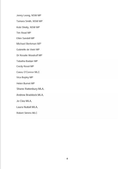 আমরা র্যাবের নেতৃত্বের ওপর মার্কিন সরকার কর্তৃক আরোপিত নিষেধাজ্ঞাকে সমর্থনসহ উল্লেখ করেছি এবং অস্ট্রেলিয়ান সরকারকে অনুরূপ পদক্ষেপ নেওয়ার আহ্বান জানিয়েছি। র্যাব ভেঙে ফেলা এবং এদের দ্বারা নিগৃত ব্যক্তিদের ন্যায়বিচার নিশ্চিতের জন্য আপনার প্রশাসনের কাছে অস্ট্রেলিয়ান বাংলাদেশ সম্প্রদায়ের অনুরোধটি আবারও আমরা লক্ষ্য করছি।