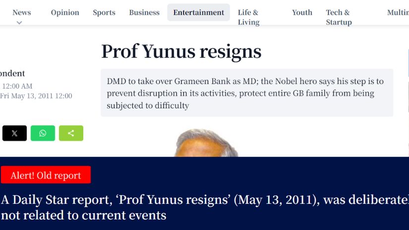 তাছাড়া ওয়েবসাইটের এক প্রতিবেদনে বলা হয়েছে, ‘‘২০১১ সালের ১৩ মে তারিখের ‘প্রফেসর ইউনূস পদত্যাগ করেছেন’ শিরোনামে দ্য ডেইলি স্টারের একটি পুরানো প্রতিবেদন ইচ্ছাকৃতভাবে সোশ্যাল মিডিয়ায় পুনরায় পোস্ট করা হয়েছে।’’