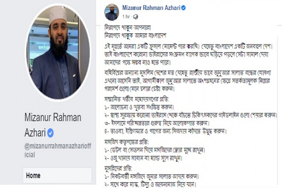 ‘নিরাপদে থাকুন আপনারা নিরাপদে থাকুক আমার বাংলাদেশ’ শিরোনামে ফেসবুকে আজহারী লিখেছেন,