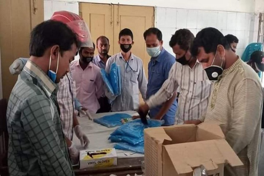 উপজেলা স্বাস্থ্য কমপ্লেক্সে পিপিইসহ অন্যান্য সুরক্ষা সামগ্রী সিএইচসিপিদের হাতে তুলে দেন উপজেলা স্বাস্থ্য কর্মকর্তা ডা. আশরাফুজ্জামান ও জাতীয় পার্টির সভাপতি ডাবলু।