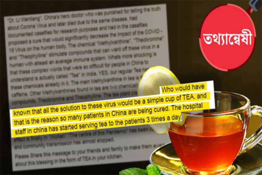 দিনে তিন বার চা খেলে নাকি সেরে যাচ্ছে করোনাভাইরাস, দাবি করা হচ্ছে ভাইরাল হওয়া এমন এক পোস্টে। তাতে বলা হচ্ছে, করোনাভাইরাস সংক্রমণ সারাতে দু’টি উপায়ের কথা বলা হচ্ছে।