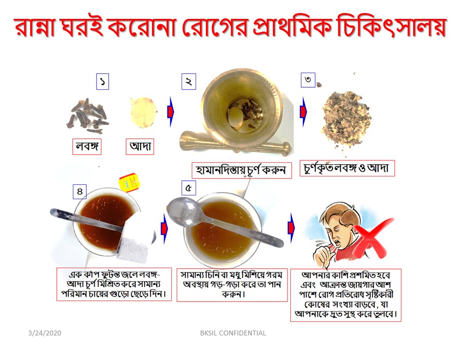 আদা (জিঞ্জার) ও লবঙ্গ (ক্লোব) করোনা মোকাবিলায় মোক্ষম হাতিয়ার হয়ে উঠতে পারে। তিনি জানান, এ দুটো মসলা একসঙ্গে পিষে তারপর ফুটন্ত গরম পানিতে তা সিদ্ধ করতে হবে। এরপর এর সঙ্গে কিছু চা পাতা দিয়ে তা এক কাপ মতো নিয়ে গারগল করে খেতে হবে। দিনে অন্তত তিন-চারবার এক কাপ করে এ দাওয়াই খেতে হবে বলে মন্তব্য তার।