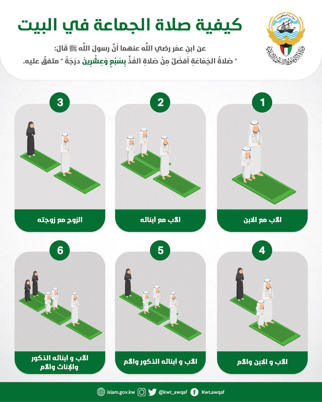 পরিবারের সদস্যদের মধ্যে যিনি শুদ্ধভাবে কুরআন তেলাওয়াত করতে পারেন এবং নামাজের প্রাথমিক নিয়মকানুন জানা আছে তিনি ইমামতি করবেন। অবশ্যই পুরুষ সদস্য হতে হবে। আর ইমামের পেছনে যথাক্রমে প্রথম কাতারে পুরুষ সদস্য এবং দ্বিতীয় কাতারে নারী সদস্যরা দাঁড়াবেন। পরিবার নিয়ে জামাআতে ঈদের নামাজসহ যে কোনো ওয়াক্তের নামাজে এ চিত্র অনুযায়ী দাঁড়ানো।