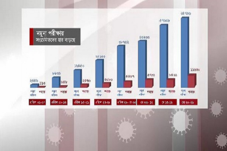 বাংলাদেশে ব্যাপক ভিত্তিতে করোনা পরীক্ষা শুরু হয় এপ্রিল থেকে। গেল মাসের প্রথম সপ্তাহে ২৪৪৯ জনের পরীক্ষা হয়। এর মধ্যে শনাক্ত হয় ১১৩ জন। অর্থাৎ শতাংশের হিসেবে ৪ দশমিক ৬১ ভাগ।