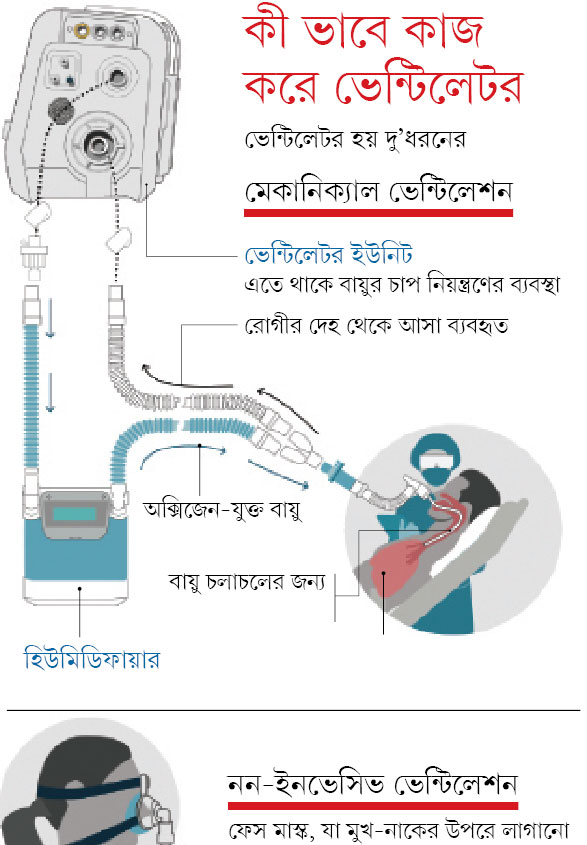 ভেন্টিলেটর কেন প্রয়োজন: রোগীর ফুসফুস যদি কাজ না করে তাহলে রোগীর নিঃশ্বাস-প্রশ্বাসের কাজটা ভেন্টিলেটর করে দেয়। এর মাধ্যমে সংক্রমণের বিরুদ্ধে লড়তে এবং পুরোপুরিভাবে সেরে উঠতে রোগী হাতে কিছুটা সময় পান। নানা ধরনের ভেন্টিলেশন যন্ত্র দিয়ে এই কাজটা করা হয়।