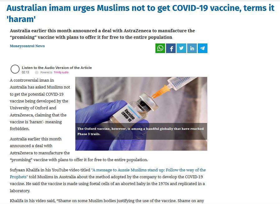 করোনার মরণ থাবা থেকে বাঁচতে একটি কার্যকর ভ্যাকসিনের জন্য অপেক্ষা করছে পুরো বিশ্ব। সম্প্রতি করোনা প্রতিরোধে আশা জাগাচ্ছে অক্সফোর্ডের সম্ভাব্য করোনা ভ্যাকসিন। তবে সেটি গ্রহণ করতে এক ক্যাথলিক আর্চবিশপের আপত্তির পর এবার এক ইমামও আপত্তি জানালেন। অস্ট্রেলিয়ার ইমাম সুফিয়ান খলিফা মুসলিমদের এটি গ্রহণ করতে নিষেধ করেছেন।