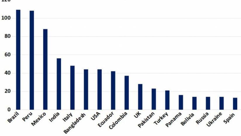 ব্রাজিল ছাড়াও ৬৯টি দেশের তালিকার সেরা ১০টির মধ্যে অন্যগুলো যথাক্রমে- দ্বিতীয় পেরু ১০৯ জন, তৃতীয় মেক্সিকো ৮৮ জন, চতুর্থ ভারত ৫৭ জন, ৫ম ইতালি ৪৯ জন, ৬ষ্ঠ বাংলাদেশে ৪৪ জন, ৭ম আমেরিকা ৪৪ জন, ৮ম ইকুয়েডর ৪২ জন, ৯ম কলিম্বিয়া ৩৭ জন এবং ১০ যুক্তরাজ্য ২৮ জন।