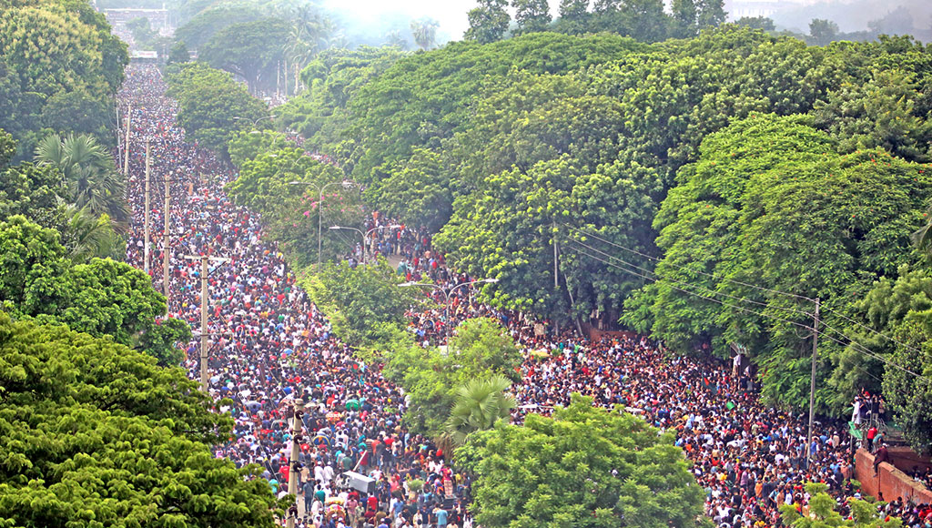 দুপুরের পর ঢাকার পথে নেমে আসে হাজার হাজার মানুষ। শাহবাগ, কেন্দ্রীয় শহীদ মিনারসহ রাজধানীর গুরুত্বপূর্ণ পয়েন্ট লোকারণ্য হয়ে ওঠে। এর মধ্যেই সামাজিক মাধ্যমে ভাইরাল হয় প্রধানমন্ত্রী শেখ হাসিনা ও শেখ রেহানার হেলিকপ্টারে দেশত্যাগের ভিডিও।