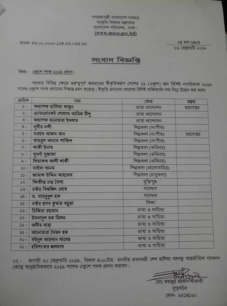 বিভিন্ন ক্ষেত্রে অবদানের জন্য অধ্যাপক হালিমা খাতুন, এ্যাডভোকেট গোলাম আরিফ টিপু, কণ্ঠশিল্পী সুবীর নন্দী, অভিনেত্রী সুবর্ণা মুস্তাফা, কথাসাহিত্যিক ইমদাদুল হক মিলনসহ ২১ বিশিষ্ট ব্যক্তিকে একুশে পদক-২০১৯ দেয়া হচ্ছে।