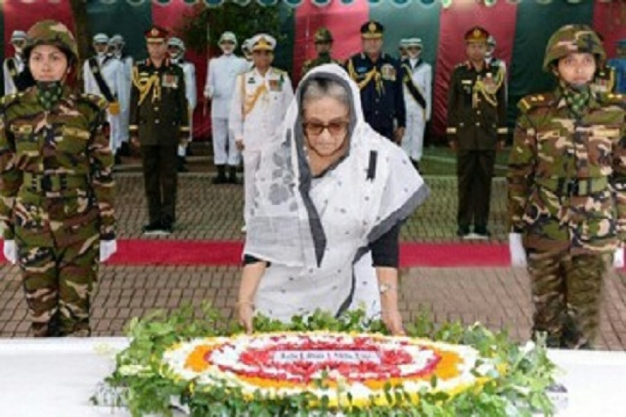 সকাল ১০টা ৬মিনিটে সমাধি সৌধের বেদীতে পুষ্পস্তবক অর্পণ করে গভীর শ্রদ্ধা জানান শেখ হাসিনা। এ সময় সশস্ত্র বাহিনীর একটি চৌকস দল তাকে অনার গার্ড দেয়। বিউগলের বেজে ওঠে করুন সুর। তখন অশ্রুসিক্ত নয়নে কিছু সময় নীরবে দাঁড়িয়ে থাকেন। পরে ফাতেহা পাঠ ও বিশেষ মোনাজাতে অংশ নেন।