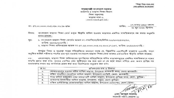 নির্দেশনায় বলা হয়েছে, শতভাগ শূন্য পাস করা পাঁচ মাদরাসার স্বীকৃতি ও এমপিও সাময়িকভাবে বাতিল করা হল। মাদরাসাগুলো হচ্ছে- ঝালকাঠির সদর উপজেলার মোকাররমপুর দরবার শরীফ দাখিল মাদরাসা ও নলছিটির দক্ষিণ খাওক্ষির মেহেদিয়া দাখিল মাদরাসা, কুমিল্লার সদর উপজেলার শাহে মদিনা হরমুজের নেছা আমতলী দাখিল মাদরাসা ও বরুড়া উপজেলার আগানগর ইসলামিয়া দাখিল মাদরাসা এবং ভোলা চরফ্যাশন উপজেলার দক্ষিণ ওসমানগঞ্জ মোজাফফরিয়া দাখিল মাদরাসা।