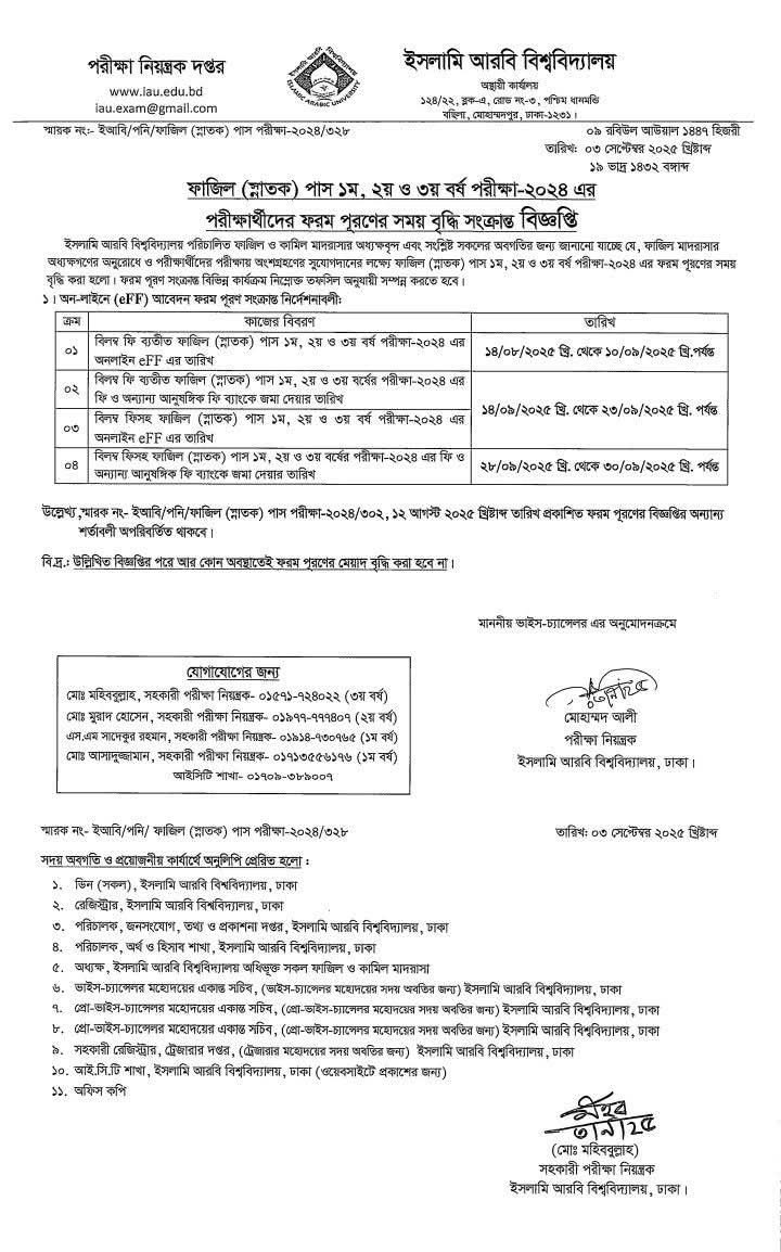 ইসলামি আরবি বিশ্ববিদ্যালয় অধীনে মাদ্রাসার ফাজিল (স্নাতক) পাস ১ম, ২য় ও ৩য় বর্ষ পরীক্ষা-২০২৪-এর ফরম পূরণের সময়সীমা বৃদ্ধি করা হয়েছে। আজ বুধবার (৩ সেপ্টেম্বর) বিশ্ববিদ্যালয়ের পরীক্ষা নিয়ন্ত্রক মোহাম্মদ আলী স্বাক্ষরিত বিজ্ঞপ্তিতে এ তথ্য জানানো হয়।